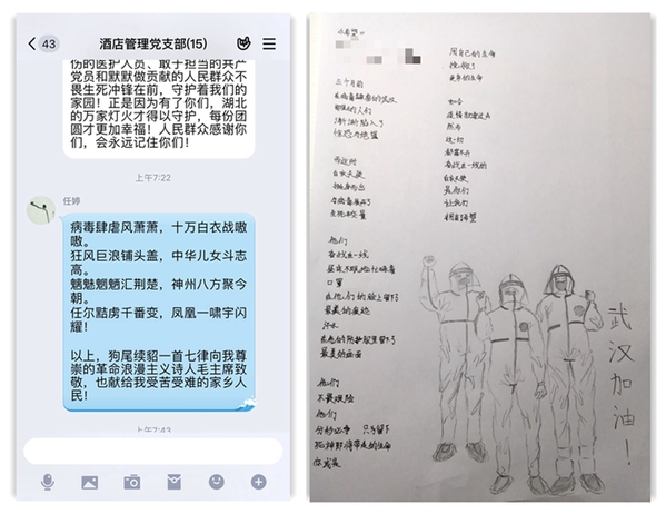 旅游与空乘党支部全体党员通过分享61位牺牲医护人员事迹后,伴随着防空警报和汽笛声的响起,集体默哀三分钟。随后通过网络祭祀平台“思念堂”为抗击疫情中牺牲的烈士敬献贡品并发悼念感言。支部书记焦巧表示:“全体党员通过今天的集体祭奠,感触很深。我们会坚决贯彻以习近平同志为核心的党中央的指示要求,在疫情防控工作和日常教学工作中,站好自己的岗位,不忘初心,积极履职、临危不惧、勇于担当、主动作为,充分发挥党员先锋带头作用。”酒店管理党支部15名党员则在支部QQ群里抒发自己的缅怀之情:任婷老师创作一首七言律诗表达对逝去英雄的敬意和对家乡人民的激励;支部书记孙嫘老师陪同女儿作诗、画画,取名《希望》……