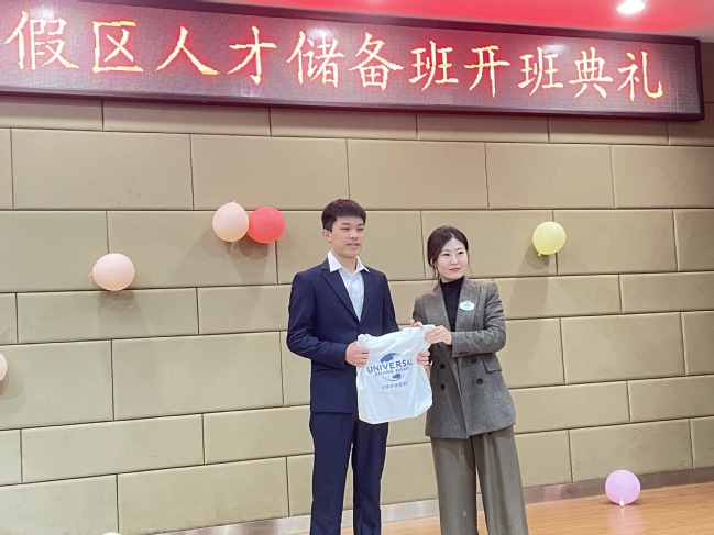 任小超作为企业方代表致辞,介绍了北京环球度假区建设历程,并分享了入职北京球环度假区以来的工作体验及感悟。他表示,希望与公司开展多方面合作,相互支持,资源共享,优势互补,促进双方事业共同发展。他鼓励学员珍惜学习机会,努力提升本领,为进入北京球环度假区工作奠定基础。