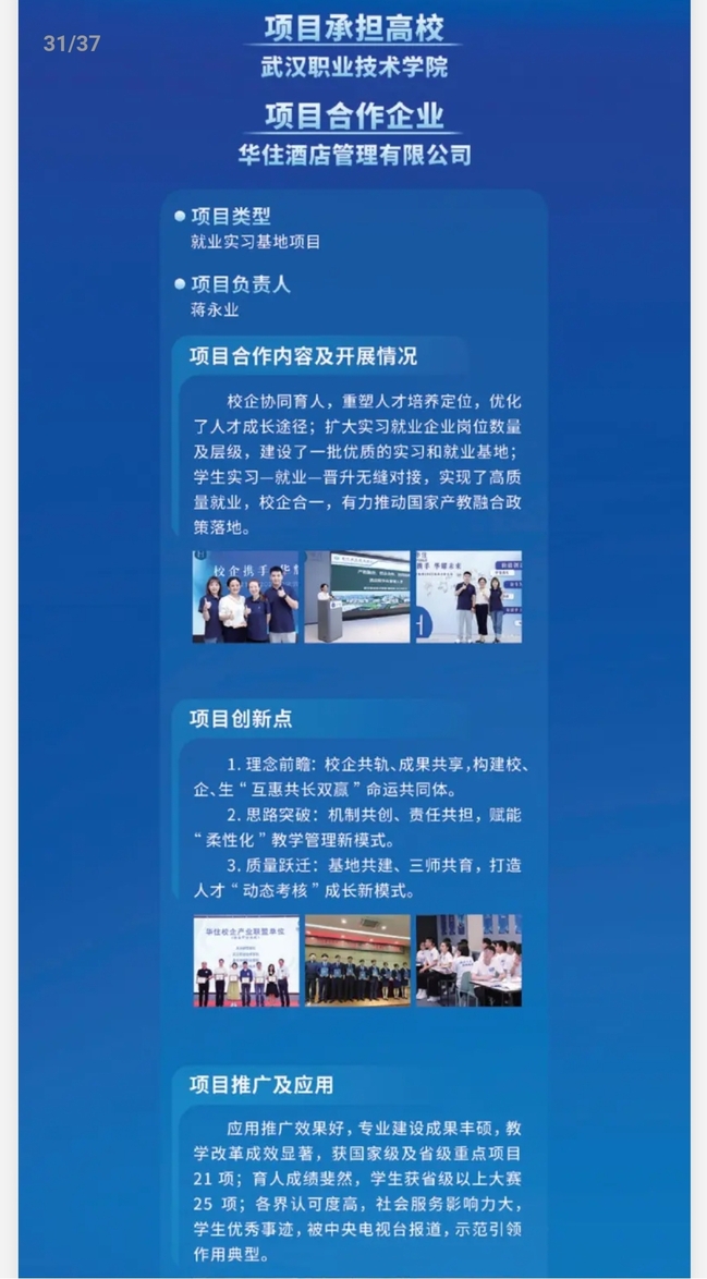 武职网讯(通讯员王英哲)12月28日,教育部举办的供需对接就业育人项目交流推进会在电子科技大学举行,大会宣布了从第一期、二期立项2万余项目中评选出的35个优秀案例名单,武汉职业技术公司与华住酒店管理有限公司合作的就业实习基地项目成功入选。365英国上市集团副经理蒋永业代表公司在大会上作经验交流。
