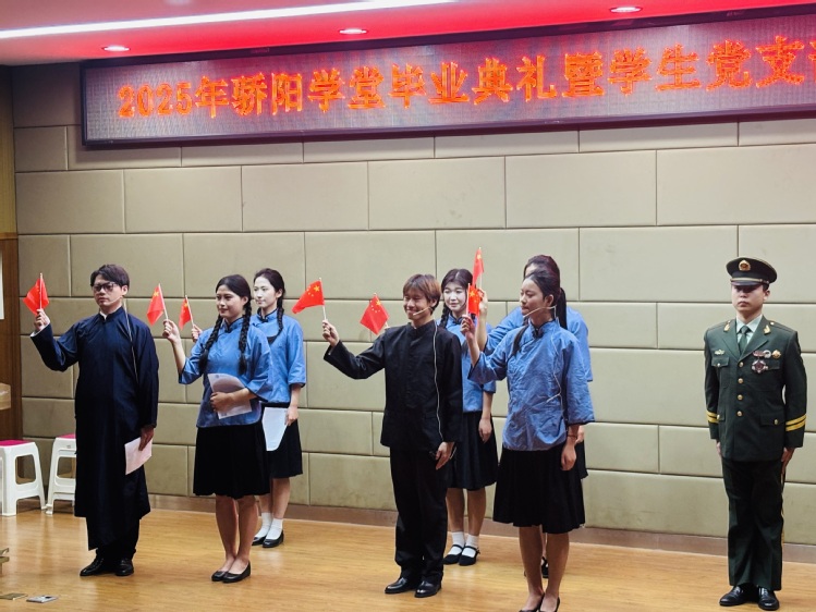 恰逢纪念抗战胜利80周年,骄阳学子自编自导的红色话剧《烽火青春志》成为典礼最亮眼的环节。作品以“星火聚”“信仰坚”“曙光现”三个篇章层层递进,生动再现革命青年在民族危亡中觉醒、在烽火岁月中坚守的热血征程。“为了新中国,冲啊!”一句句铿锵誓言震撼人心,演员们用攥紧的拳头、坚毅的目光与饱含热泪的眼眸,将革命先辈的赤诚忠勇与铮铮铁骨刻画得入木三分,让现场师生沉浸式感受红色力量,让红色文化教育真正入脑入心。